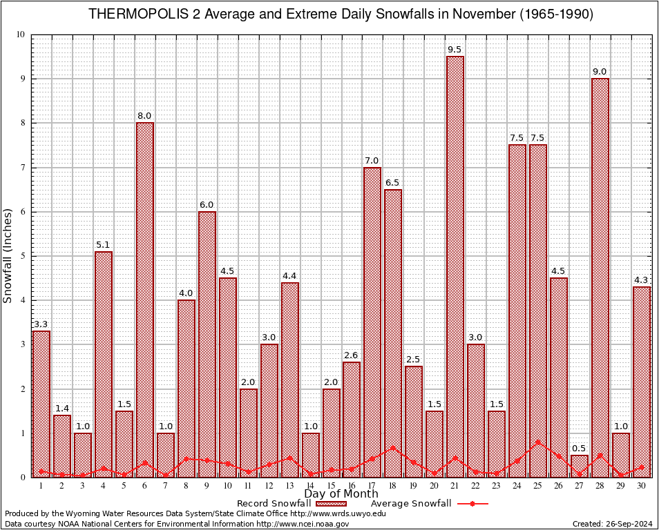 November Average and Extreme Daily Snowfall AMounts (1965-1990)