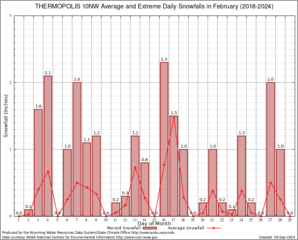 February Average and Extreme Daily Snowfall AMounts (2018-2024)