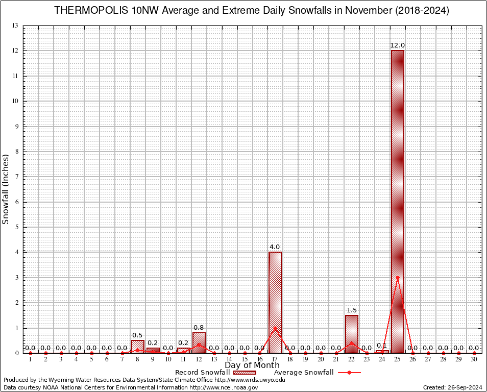 November Average and Extreme Daily Snowfall AMounts (2018-2024)