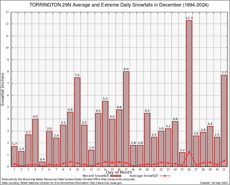 December Average and Extreme Daily Snowfall AMounts (1994-2024)