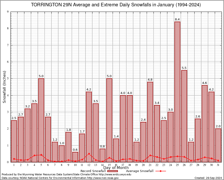 January Average and Extreme Daily Snowfall AMounts (1994-2024)