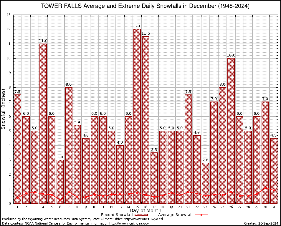 December Average and Extreme Daily Snowfall AMounts (1948-2024)