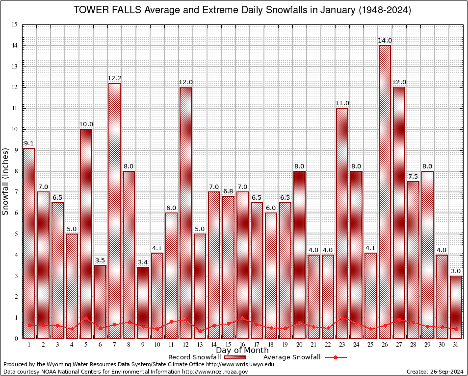 January Average and Extreme Daily Snowfall AMounts (1948-2024)