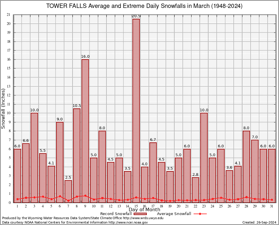 March Average and Extreme Daily Snowfall AMounts (1948-2024)