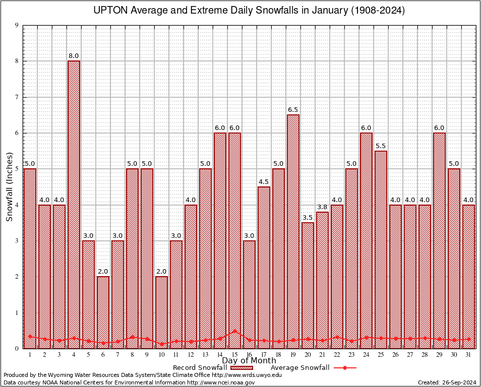 UPTON (489205) January Average and Extreme Daily Snowfall AMounts (1908-2024) To index page for UPTON