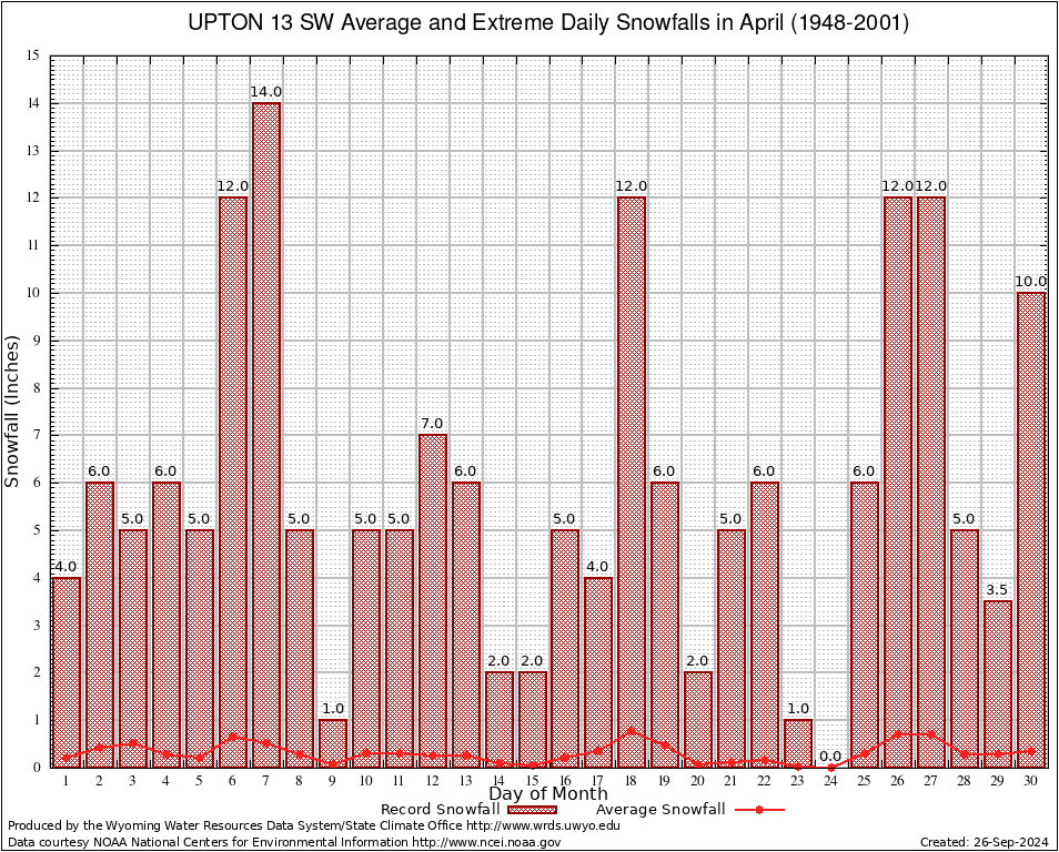 April Average and Extreme Daily Snowfall AMounts (1948-2001)
