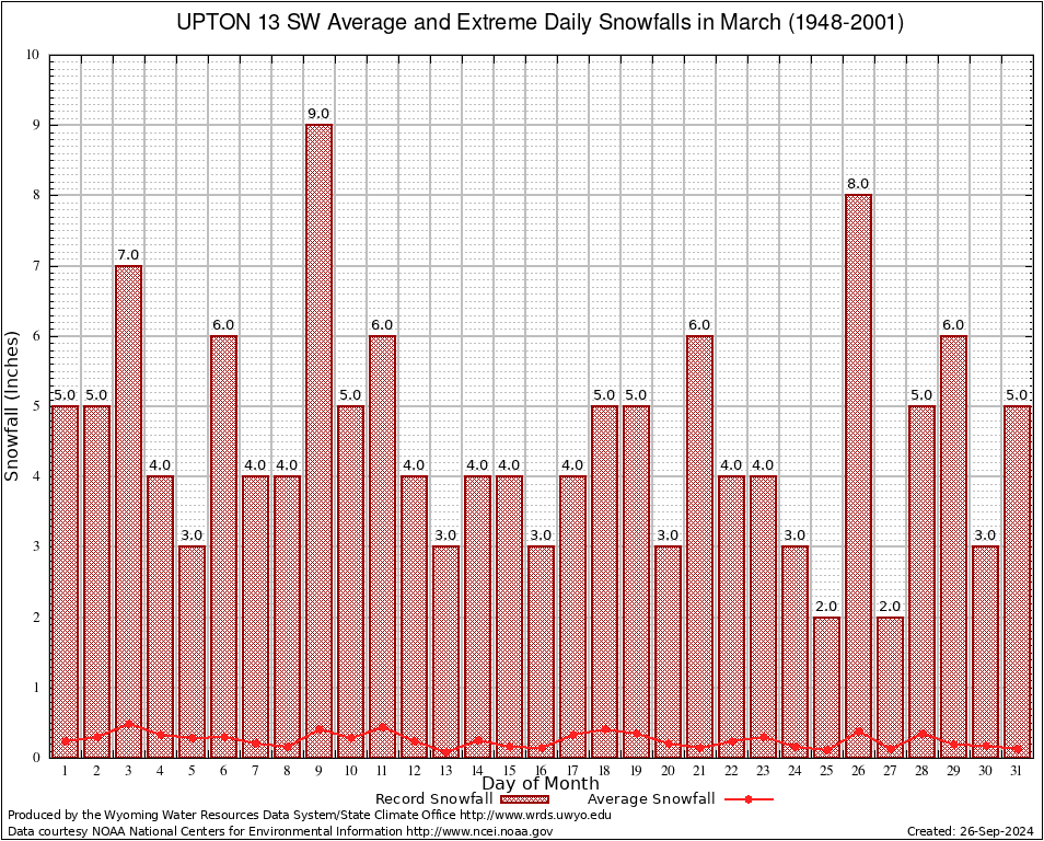 March Average and Extreme Daily Snowfall AMounts (1948-2001)