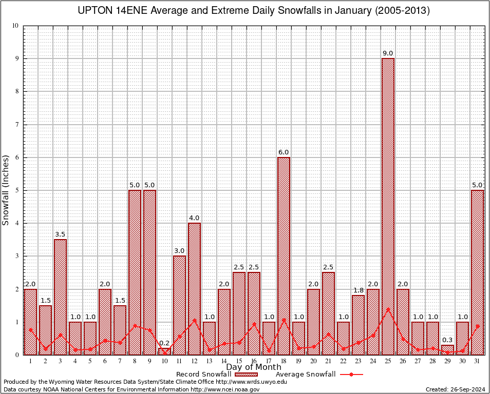 January Average and Extreme Daily Snowfall AMounts (2005-2013)