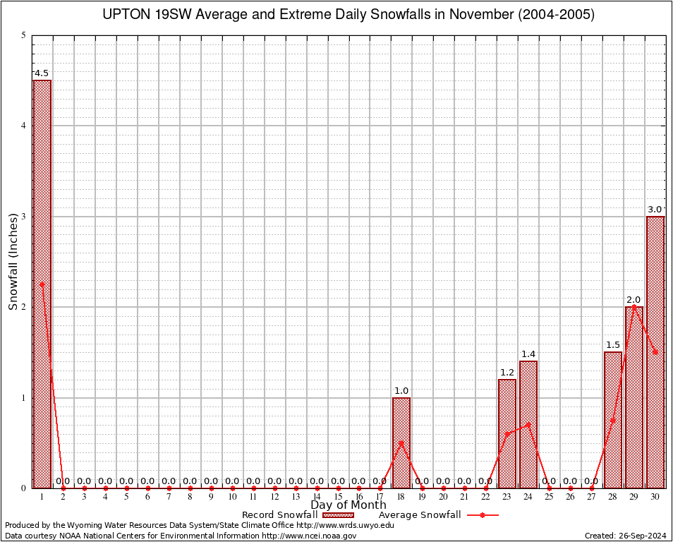 UPTON 19SW (489212) November Average and Extreme Daily Snowfall AMounts (2004-2005) To index page for UPTON 19SW
