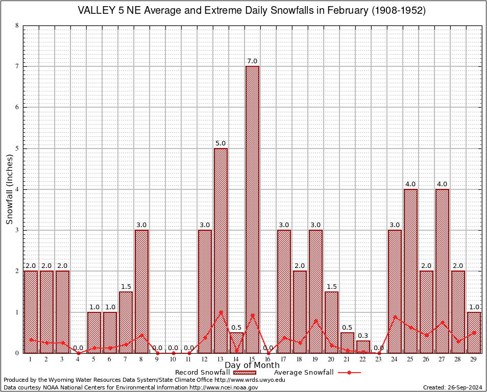 February Average and Extreme Daily Snowfall AMounts (1908-1952)