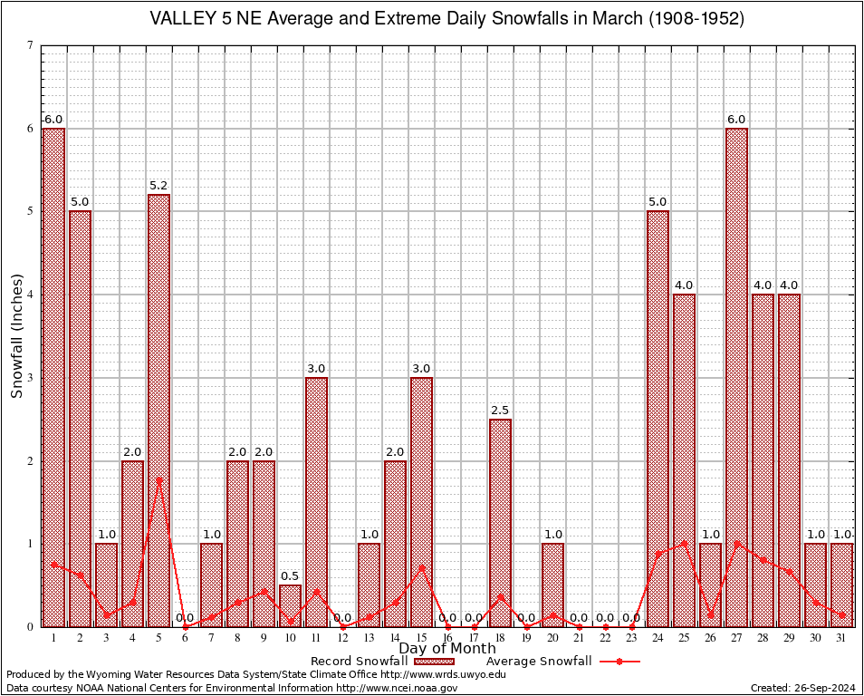 March Average and Extreme Daily Snowfall AMounts (1908-1952)