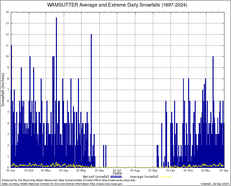 WAMSUTTER (489459) Annual Average and Extreme Daily Snowfall AMounts (1897-2024) To index page for WAMSUTTER