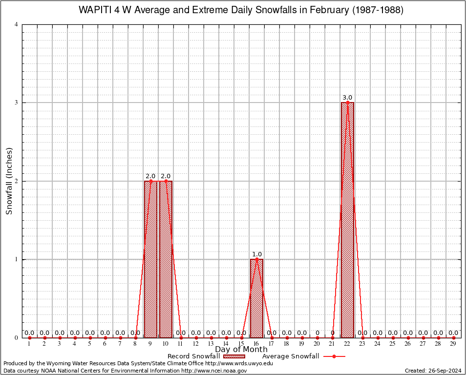 WAPITI 4 W (489479) February Average and Extreme Daily Snowfall AMounts (1987-1988) To index page for WAPITI 4 W
