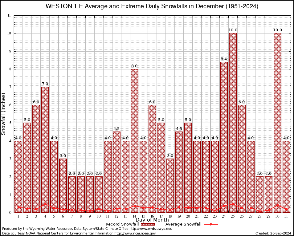 WESTON 1 E (489580) December Average and Extreme Daily Snowfall AMounts (1951-2024) To index page for WESTON 1 E