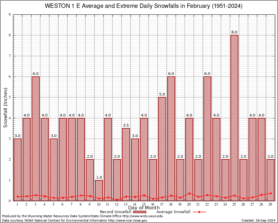 WESTON 1 E (489580) February Average and Extreme Daily Snowfall AMounts (1951-2024) To index page for WESTON 1 E