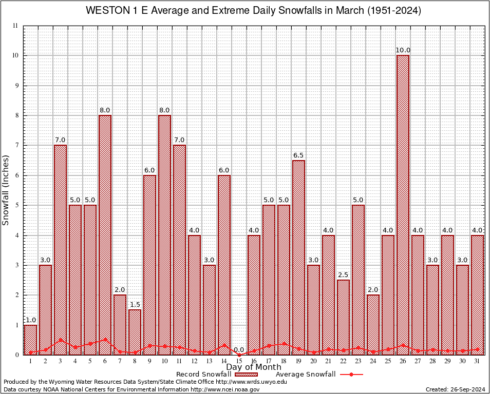 March Average and Extreme Daily Snowfall AMounts (1951-2024)