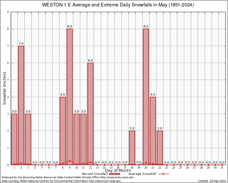 May Average and Extreme Daily Snowfall AMounts (1951-2024)