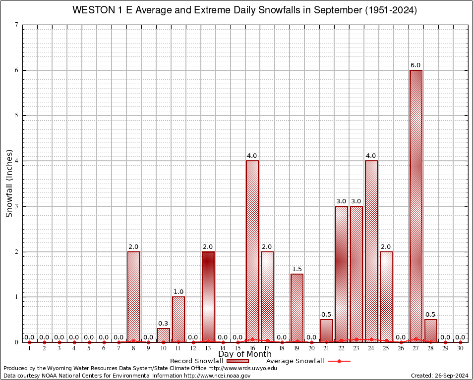 WESTON 1 E (489580) September Average and Extreme Daily Snowfall AMounts (1951-2024) To index page for WESTON 1 E
