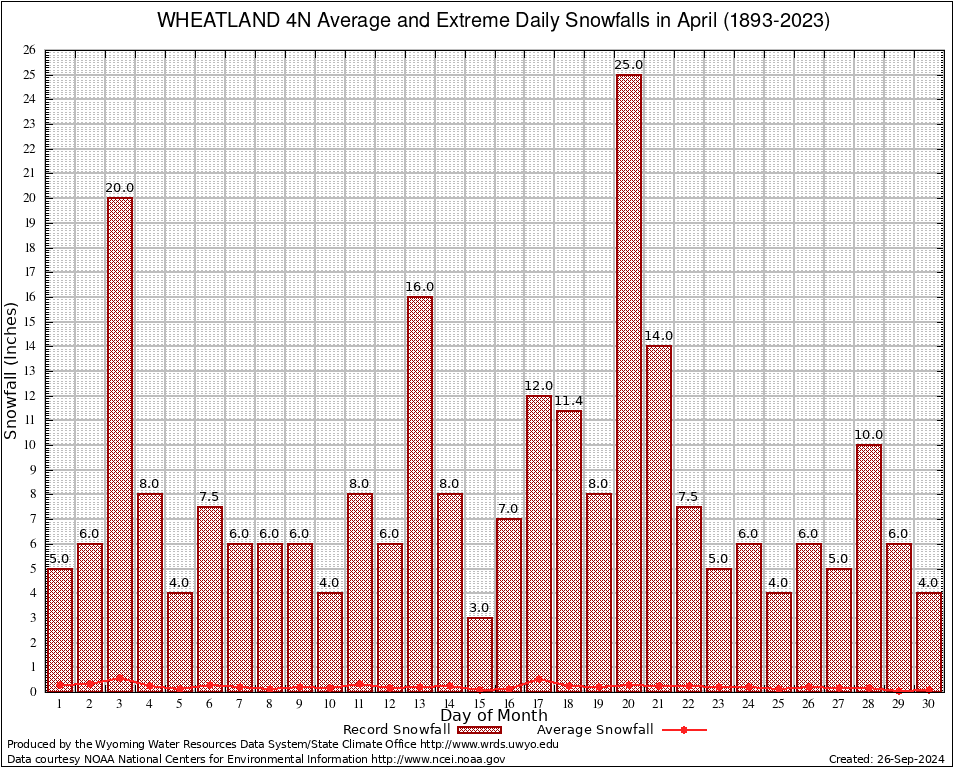 April Average and Extreme Daily Snowfall AMounts (1893-2023)