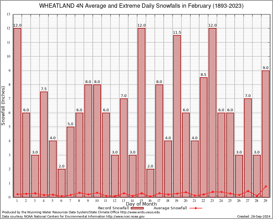February Average and Extreme Daily Snowfall AMounts (1893-2023)