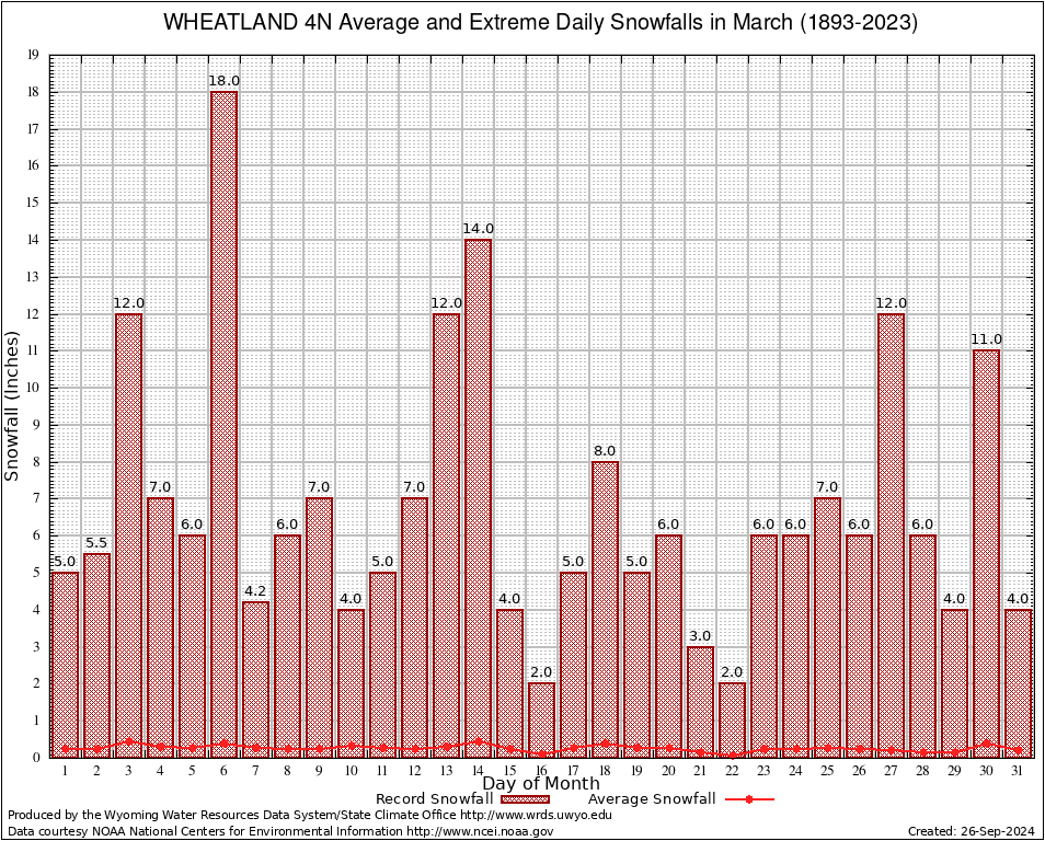 March Average and Extreme Daily Snowfall AMounts (1893-2023)