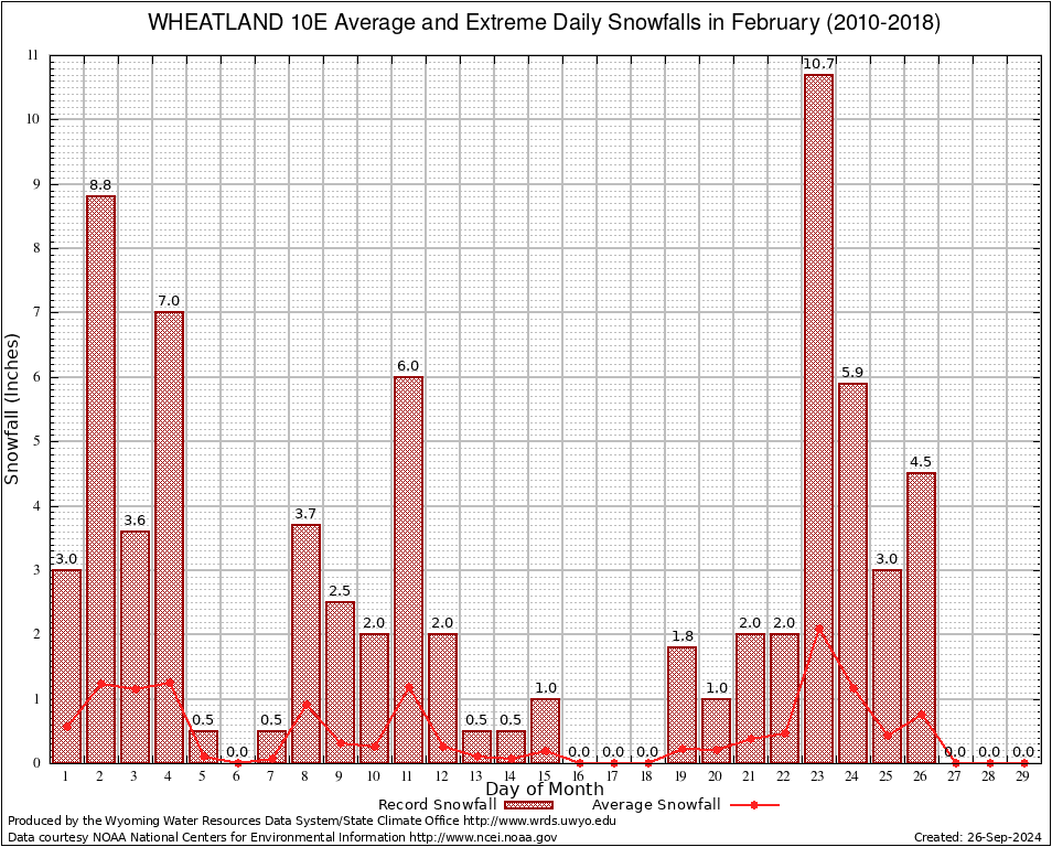 February Average and Extreme Daily Snowfall AMounts (2010-2018)