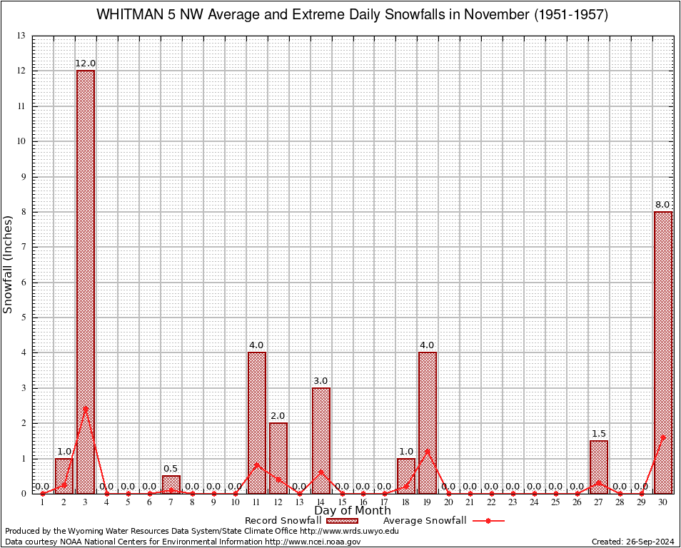 November Average and Extreme Daily Snowfall AMounts (1951-1957)