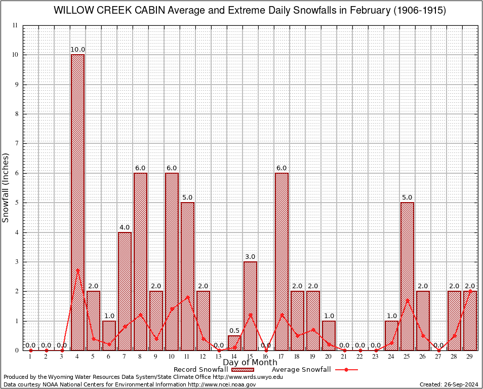 February Average and Extreme Daily Snowfall AMounts (1906-1915)