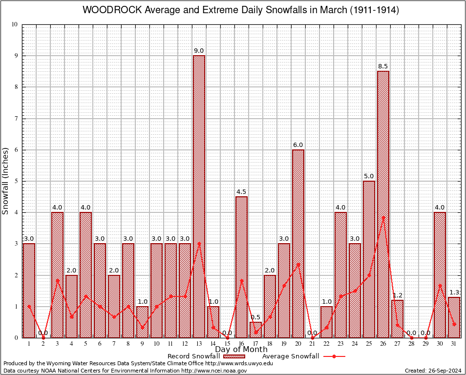 WOODROCK (489713) March Average and Extreme Daily Snowfall AMounts (1911-1914) To index page for WOODROCK
