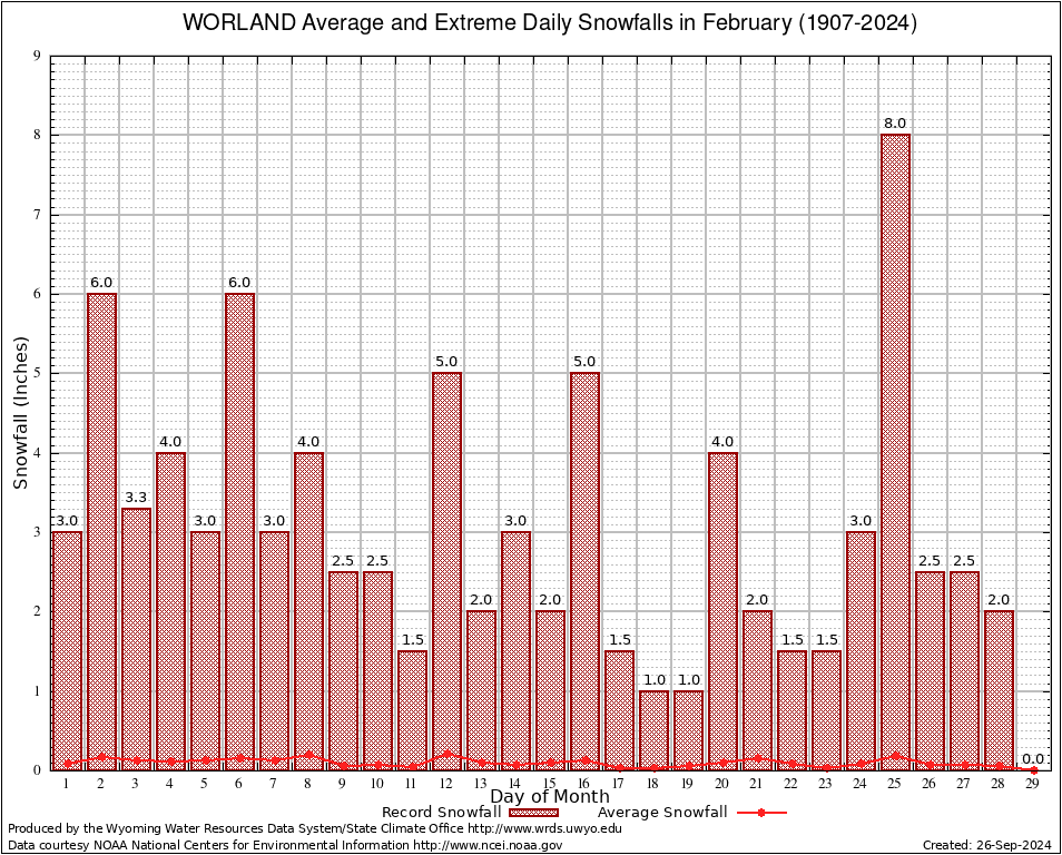 WORLAND (489770) February Average and Extreme Daily Snowfall AMounts (1907-2024) To index page for WORLAND