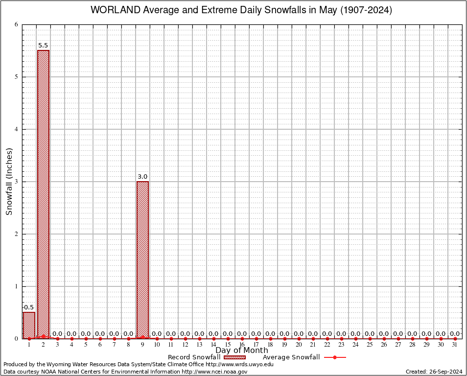 WORLAND (489770) May Average and Extreme Daily Snowfall AMounts (1907-2024) To index page for WORLAND