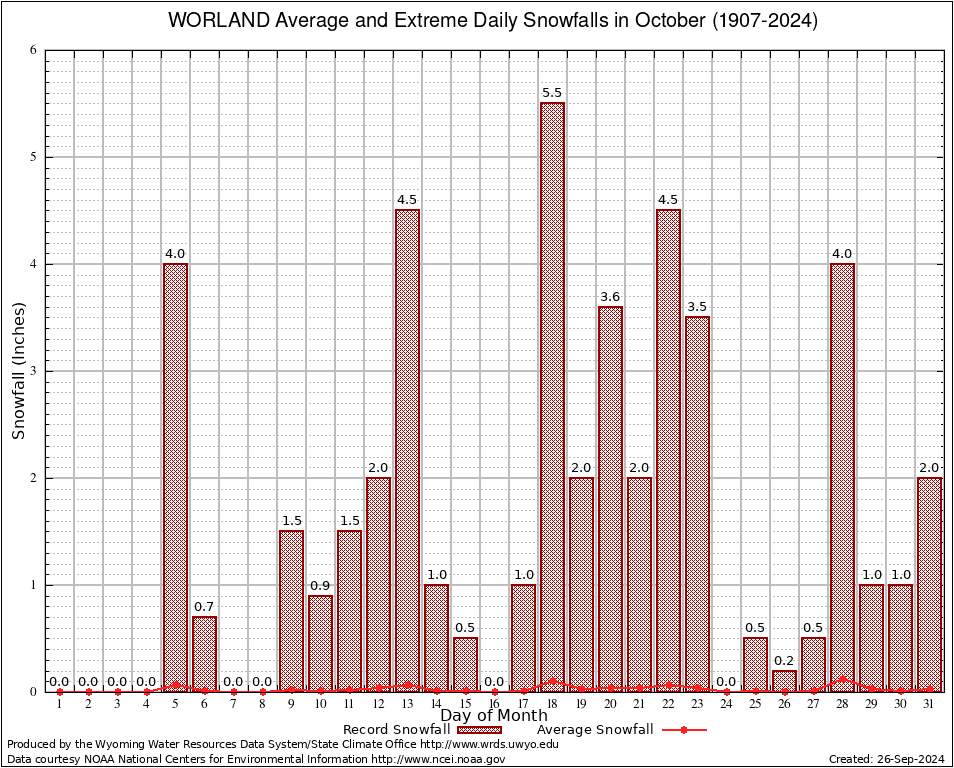WORLAND (489770) October Average and Extreme Daily Snowfall AMounts (1907-2024) To index page for WORLAND