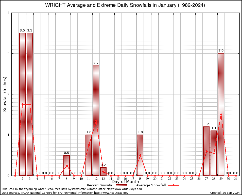 WRIGHT (489800) January Average and Extreme Daily Snowfall AMounts (1982-2024) To index page for WRIGHT