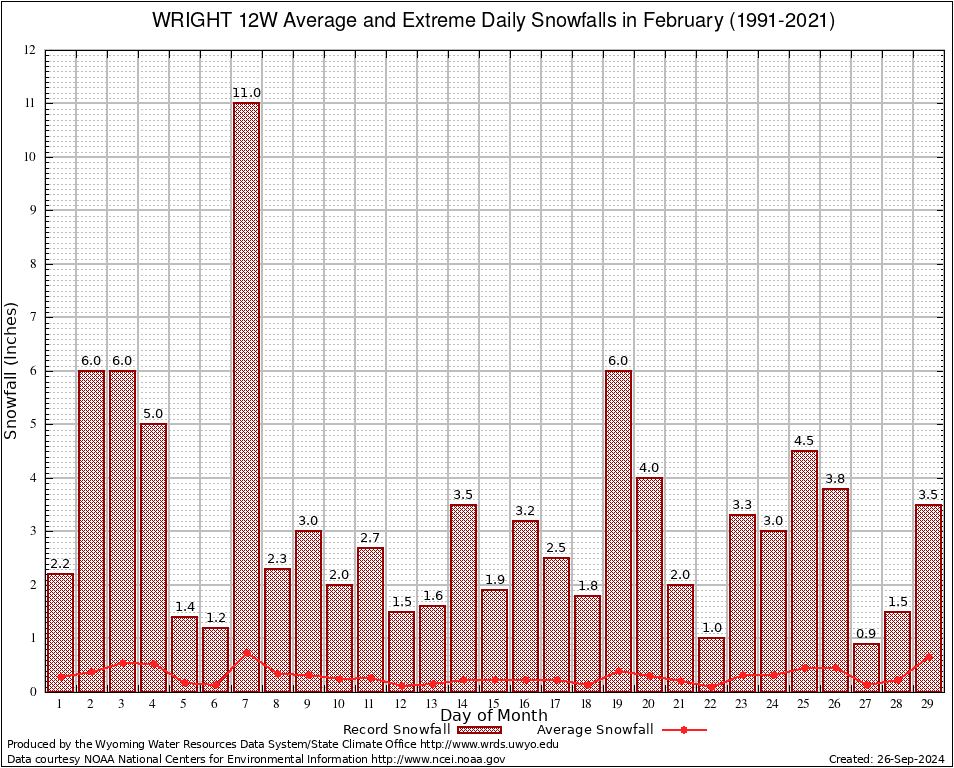 WRIGHT 12W (489805) February Average and Extreme Daily Snowfall AMounts (1991-2021) To index page for WRIGHT 12W