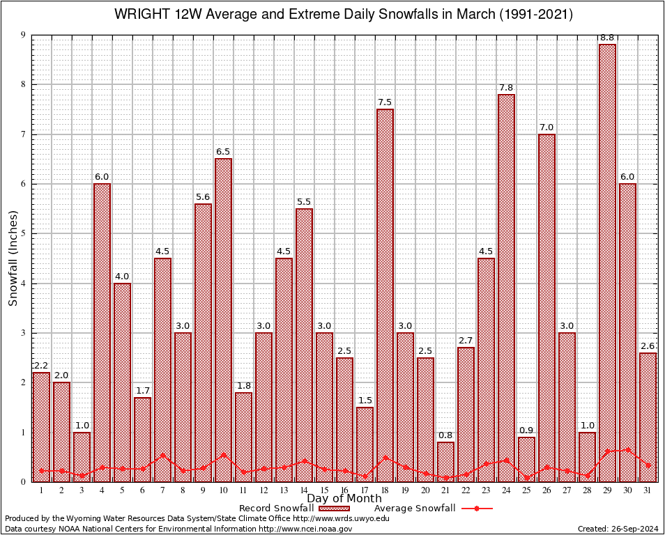 March Average and Extreme Daily Snowfall AMounts (1991-2021)
