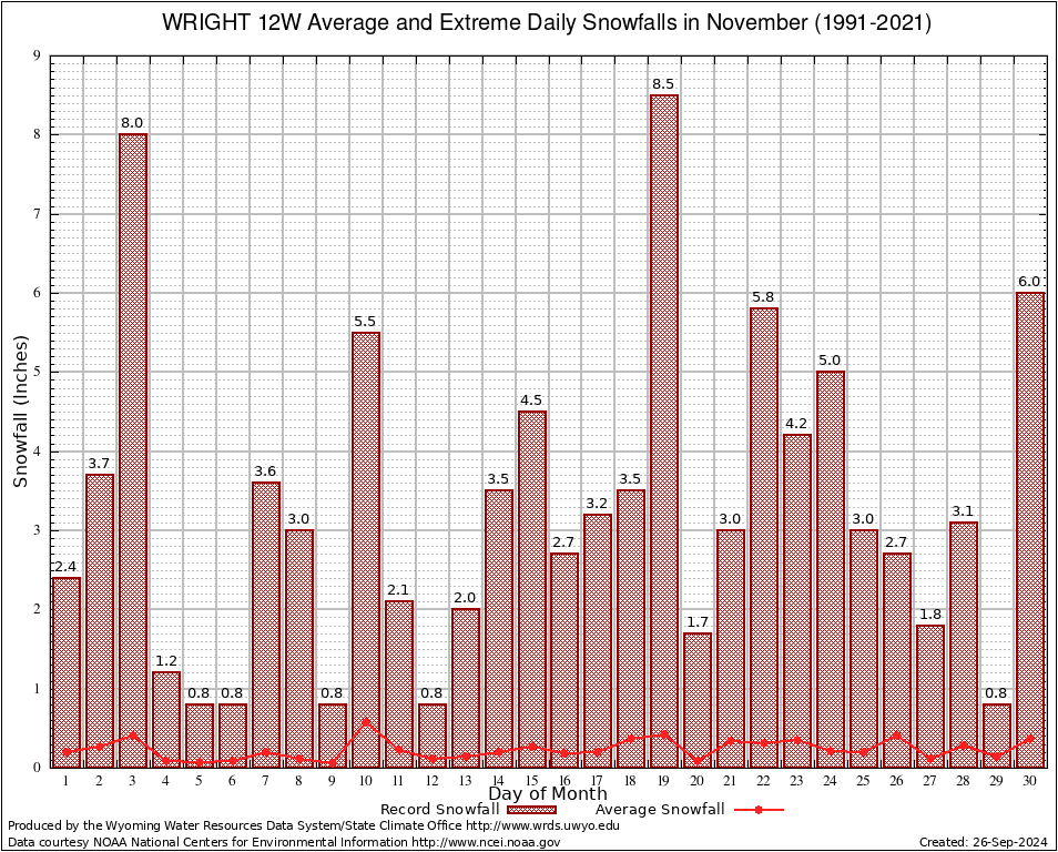 WRIGHT 12W (489805) November Average and Extreme Daily Snowfall AMounts (1991-2021) To index page for WRIGHT 12W