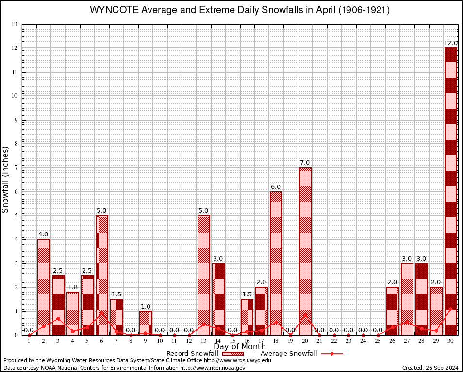 WYNCOTE (489880) April Average and Extreme Daily Snowfall AMounts (1906-1921) To index page for WYNCOTE