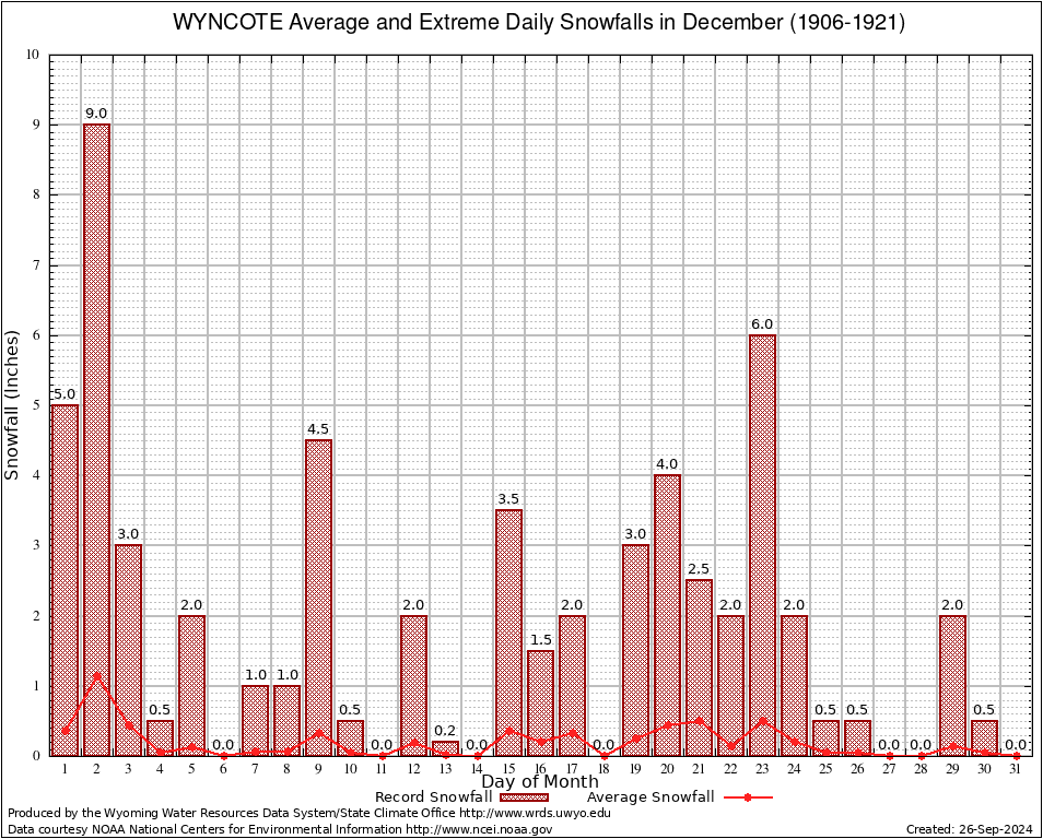 WYNCOTE (489880) December Average and Extreme Daily Snowfall AMounts (1906-1921) To index page for WYNCOTE