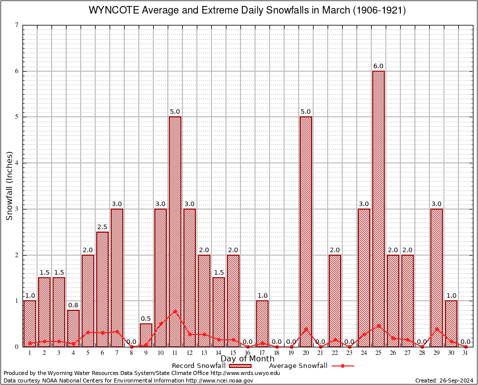WYNCOTE (489880) March Average and Extreme Daily Snowfall AMounts (1906-1921) To index page for WYNCOTE