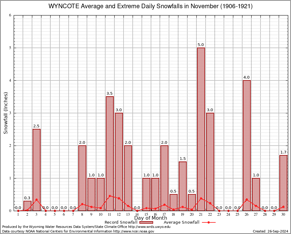 WYNCOTE (489880) November Average and Extreme Daily Snowfall AMounts (1906-1921) To index page for WYNCOTE