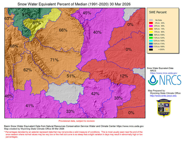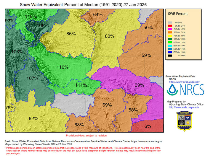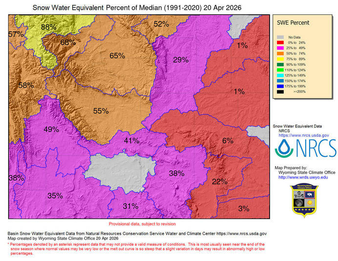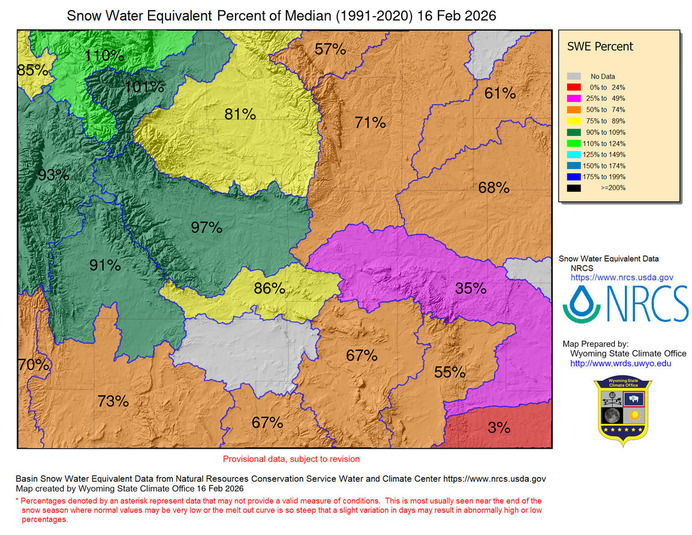 Wyoming basins. Normal (median) is based on all reporting SNOTEL sites in the